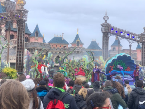 Nella parte posteriore di Fantasyland, si può ammirare la balconata del livello superiore dove si gode di un ottimo panorama, anche perchè il castello di Parigi è l'unico in cui si può entrare dentro, tanto che ci hanno costruito 2 boutique, la prima si trova appena si entra nel castello e la sua particolarità sta nel vendere oggetti natalizi tutto l'anno, mentre se si salgono le scale ci troviamo un mini museo con vetrate e arazzi tutti dipinti a mano con dei richiami medievali e raccontano la storia della bella addormentata nel bosco, ed è da qui che si accede alla fantastica balconata.